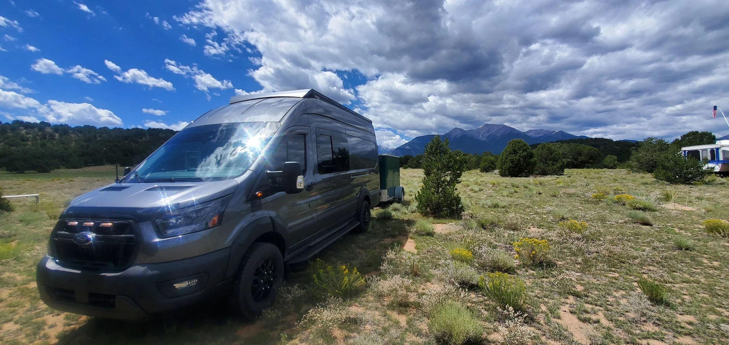 Our van build, a 2023 Ford Transit Trail, High Roof, Extended length in carbonized grey.
